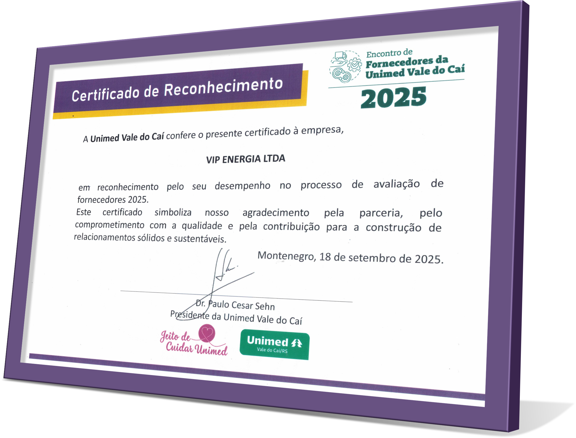A VIP Energia recebeu, da Unimed Vale do Caí, o Certificado de Reconhecimento 2025, como destaque no processo de avaliação de fornecedores.